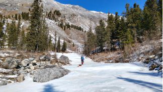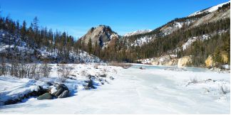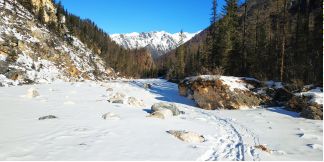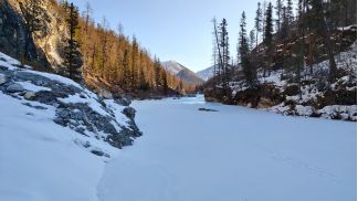 поднимаемся по р. Яман-Гол, есть спусковая лыжня